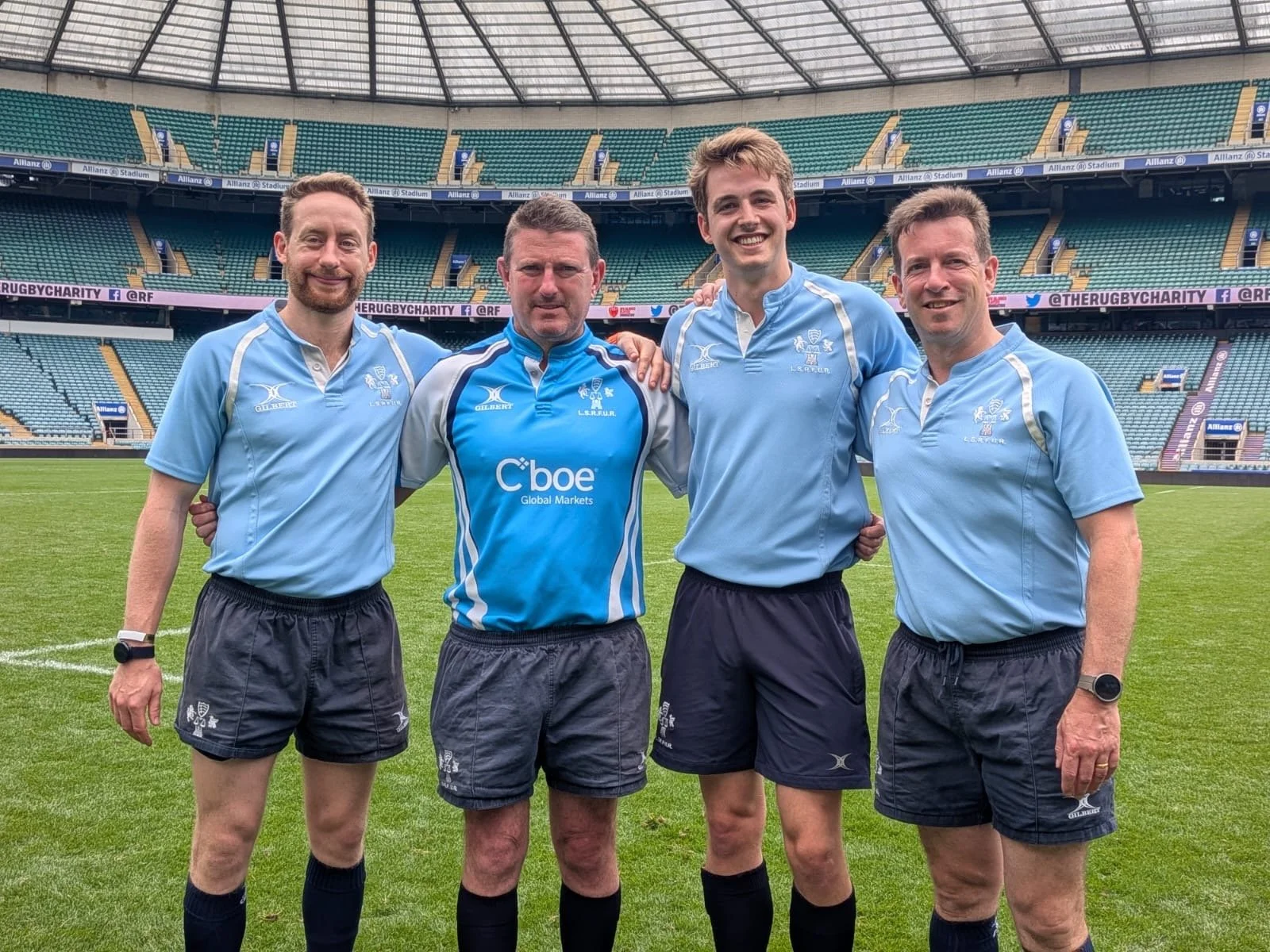 On Saturday 24th May, I had the incredible opportunity to referee at Allianz Stadium Twickenham during the Veterans Rugby Tournament, raising funds for the RFU Injured Players Foundation. Alongside fellow London Society referees—Gavin Nichols, Matt Isherwood, and Ben Allanson—we proudly flew the LSRFUR flag on one of the most iconic rugby stages in the world.